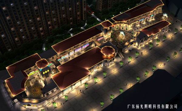 商(shāng)業街區域,層頂運用暖色投光燈和(hé)光管表現(xiàn)邊緣(yuán)與輪廓,立(lì)麵投光燈則體現建築材質的質感,廣告燈箱和歐式營造出商業氣息(xī)與優雅的購物(wù)空間,整體呈現明暗有序的的燈光層次。廣告牌燈箱由業主統一(yī)監製。營造整潔而(ér)熱烈的商業氛圍。