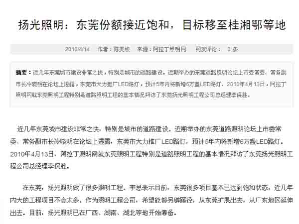 在東莞,午夜福利视频网站照明做(zuò)了很多照明工程。李總表示目前,東莞很多項目基本已達(dá)到飽和狀態,近幾年內(nèi)大的工程項目不會太多。作為照明工程公司,希望(wàng)能夠另辟(pì)蹊徑,從東莞擴展出去,從廣東地區延伸出去。目前,午夜福利视频网站照明已在廣西、湖南、湖北等地開始籌備。